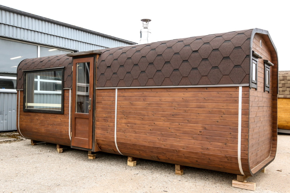 • Thermoholzrahmen mit Dacheindeckung und Fundamentstützen,